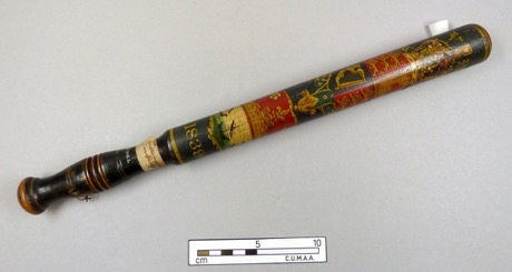 A painted wooden truncheon. Depicted on the truncheon is th…