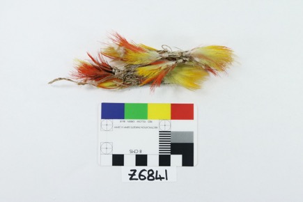 Bundles of yellow and red feathers used as fishing bait.