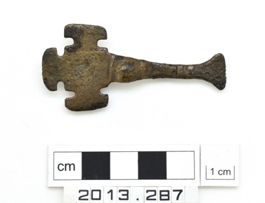 Cast copper alloy small long brooch. Square headplate with …