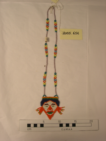 A bead necklace with a triangular shaped face in blue, gree…