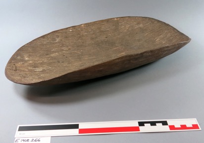 Wooden bowl with rounded bottom and ends. The inside is fin…