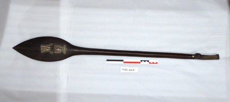 Paddle shaped wooden club. Carved designs on both faces of …