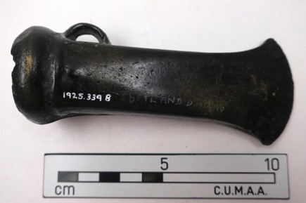 Socketed axe, fine brown-green patina, black patches, mouth…