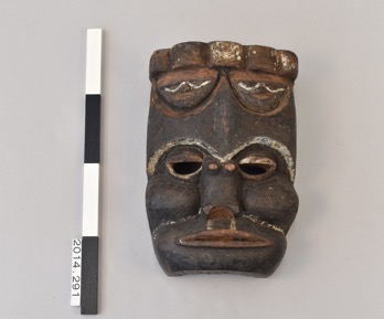 Wooden mask with moveable jaw. Traces of white pigment on f…