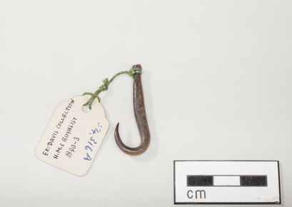 Fish-hook of metal. A piece of mother-of-pearl carved in th…