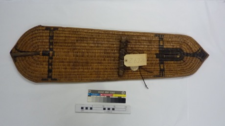shield - Flat, oval wickerwork shield with rounded ends, a …