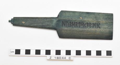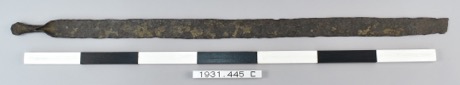 Sword-shaped iron currency bar. The bar has a short pinched…