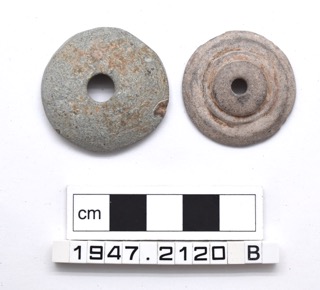Convex cone disc of sandstone and tiered disc bead of shale…