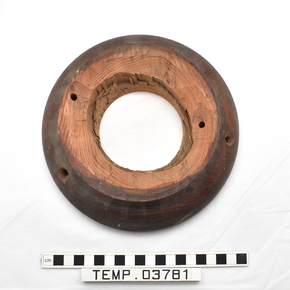 Circular wooden plinth or base, possibly a museum mount. Tu…