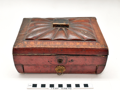 Sewing or jewellery box, wood covered in red leather with g…