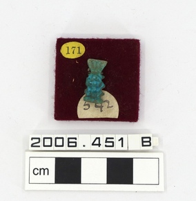 A blue-green faience Bes amulet with suspension hole.