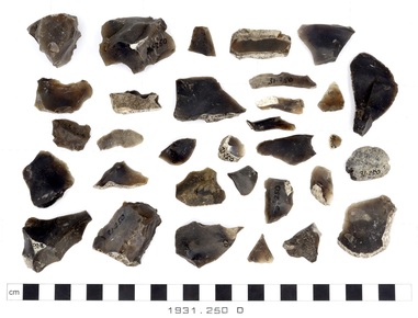 32 fragments of dark, semi-translucent flint, partly retain…