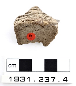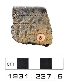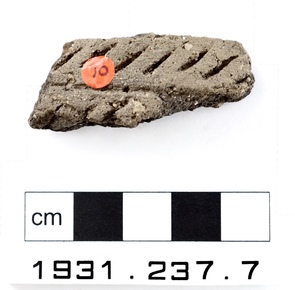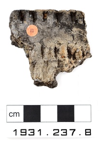One rim sherd of coarse, dark grey fabric, decorated on the…