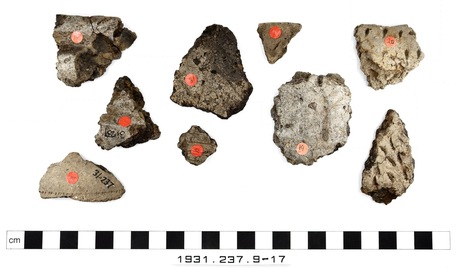 9 sherds of varying fabrics, including at least one rim she…