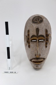 Narrow oval mask featuring a human face, with features outl…