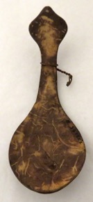 Sago scraper of wood with metal inserts.