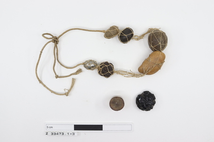 Necklace charm consisting of large oval tin bead, a small c…