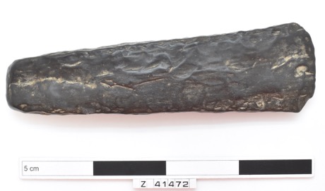 A centred-edge stone adze, possibly basalt, with square edg…