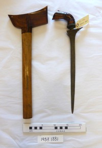 Knife in plain wooden scabbard. Blade very wide, 2-edged an…