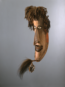 Mask of heavy wood representing a long bearded face used in…