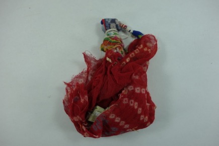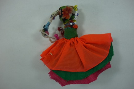 Doll made of scraps of colourful fabric, bound with string …