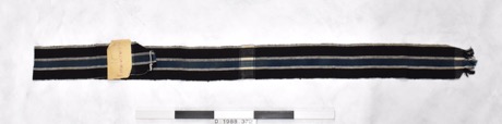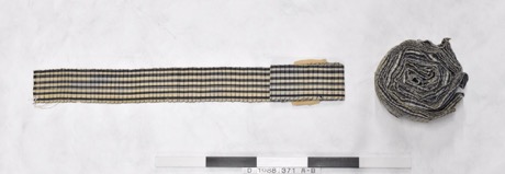 Long piece of woven cotton wound up [A]. Blue and white che…
