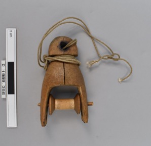 A wooden pulley, part of a weaving apparatus. The pulley ha…