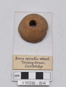 Spindle whorl made of bone, hemispherical in shape with a c…
