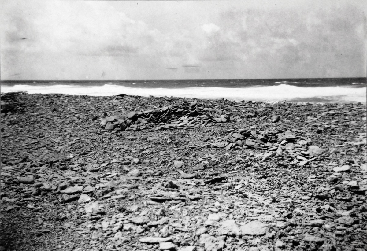 On Catalogue Card: Sites 7,8,9. Shelters or fireplaces in norhtern group associated with site 4. Site 7 half in picture at left. Sea in background. Hull Island. Phoenix group
