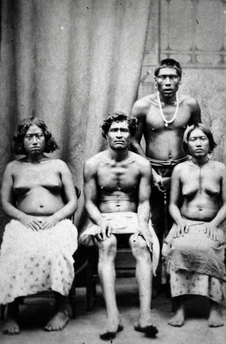 One man and two women sitting on chairs, wearing ?printed cloths of European manufacture. Another man is standing behind them, holding onto the back of the chair of the woman on the right.