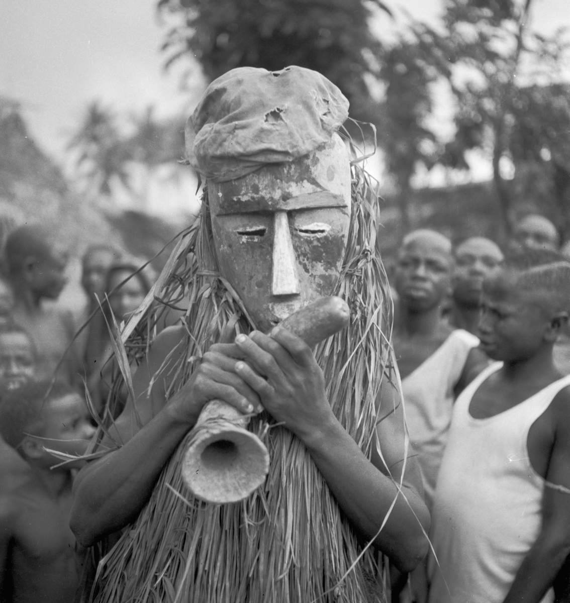 A close up view of a masquerade character performing in the Okwanku masquerade wearing a wooden face mask with high forehead, slit eyes, long nose, mouth, long raffia hair and a hat on top. The face of the mask has white pigment. The character is playing a horned instrument. In the background are spectators.