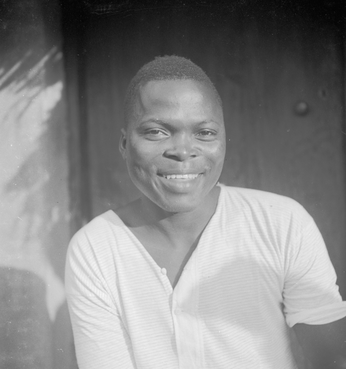 Half-length portrait of an Igbo man, smiling, and wearing a white collar less shirt.