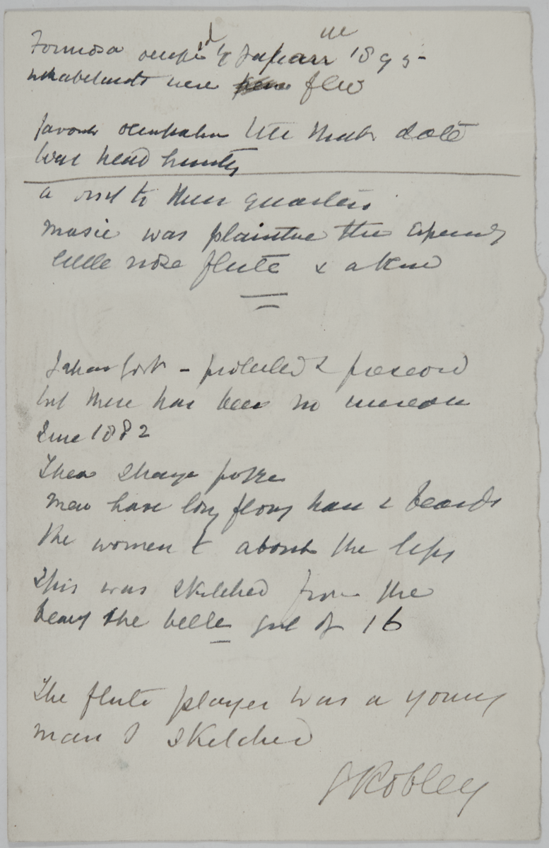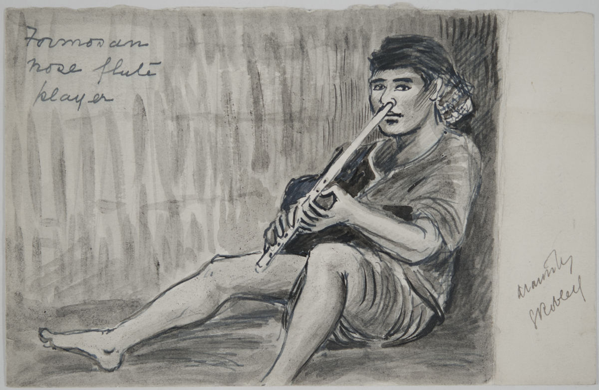 Drawing of a Taiwanese man, problably from south Taiwan, sitting playing a long nose flute. The man wears a headdress, typical style of south Taiwan with embroidery at both ends. [Information provided by Chia-yu Hu, Associate Professor, Department of Anthropology, National Taiwan University, JD 8/7/2010]