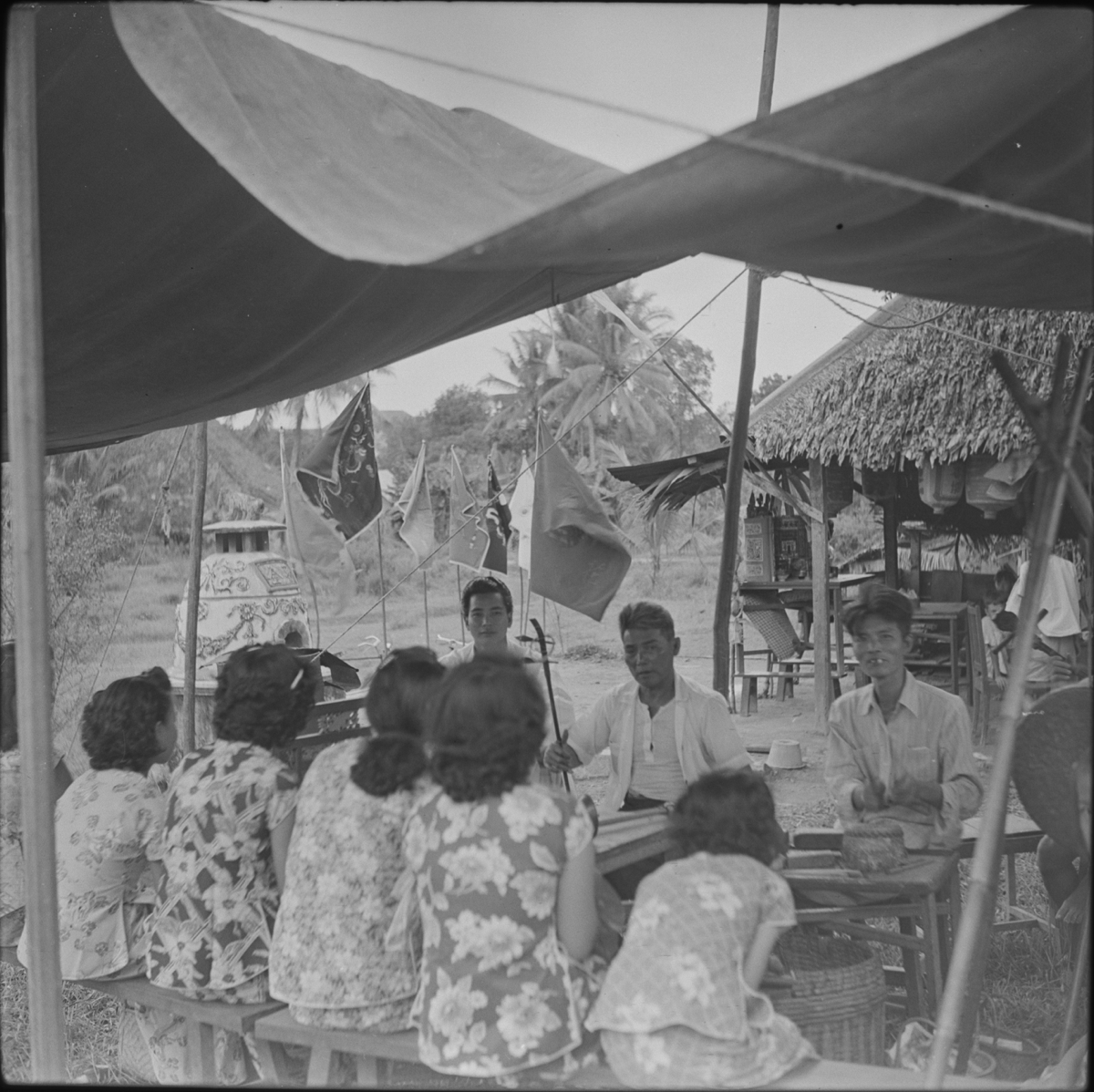 A small group of men and women sit on wooden benches under a canvas awning next to a wooden building with an attap (thatched) roof. Behind them are a large ceramic incense-burner and six flags attached to bamboo poles in the ground. [EB 07/09/2022]
