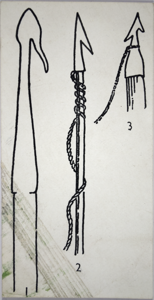 Photomechanical reproduction of an Illustration of 3 x notched fishing spears. [GB 11/07/2000]