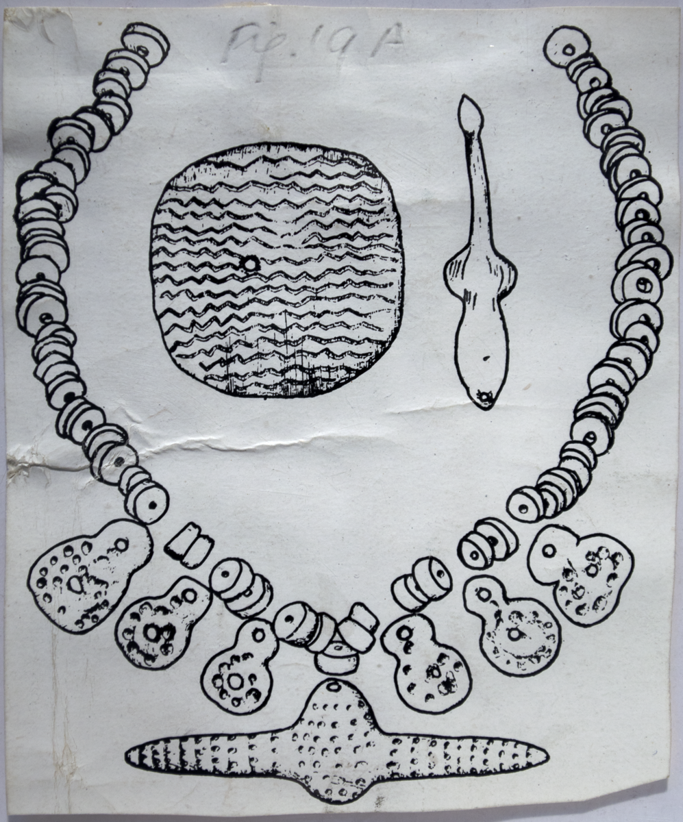 Photomechanical reproduction of an Illustration of a carved bead necklace and fish-like pendant. [GB 11/07/2000]