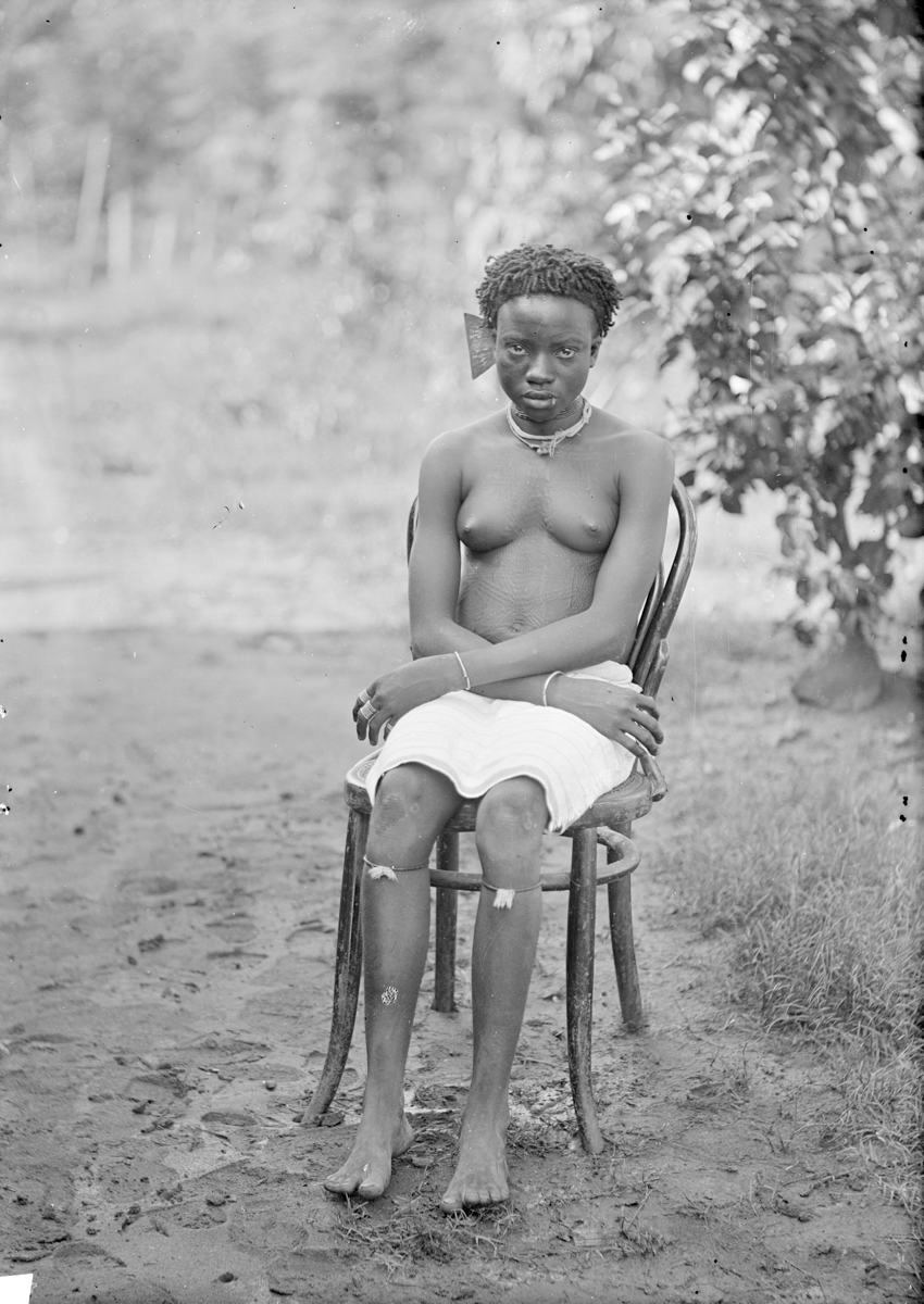 A woman sitting on a wooden chair posing for the camera. She is wearing a white cotton waist cloth and a necklce around her neck.
