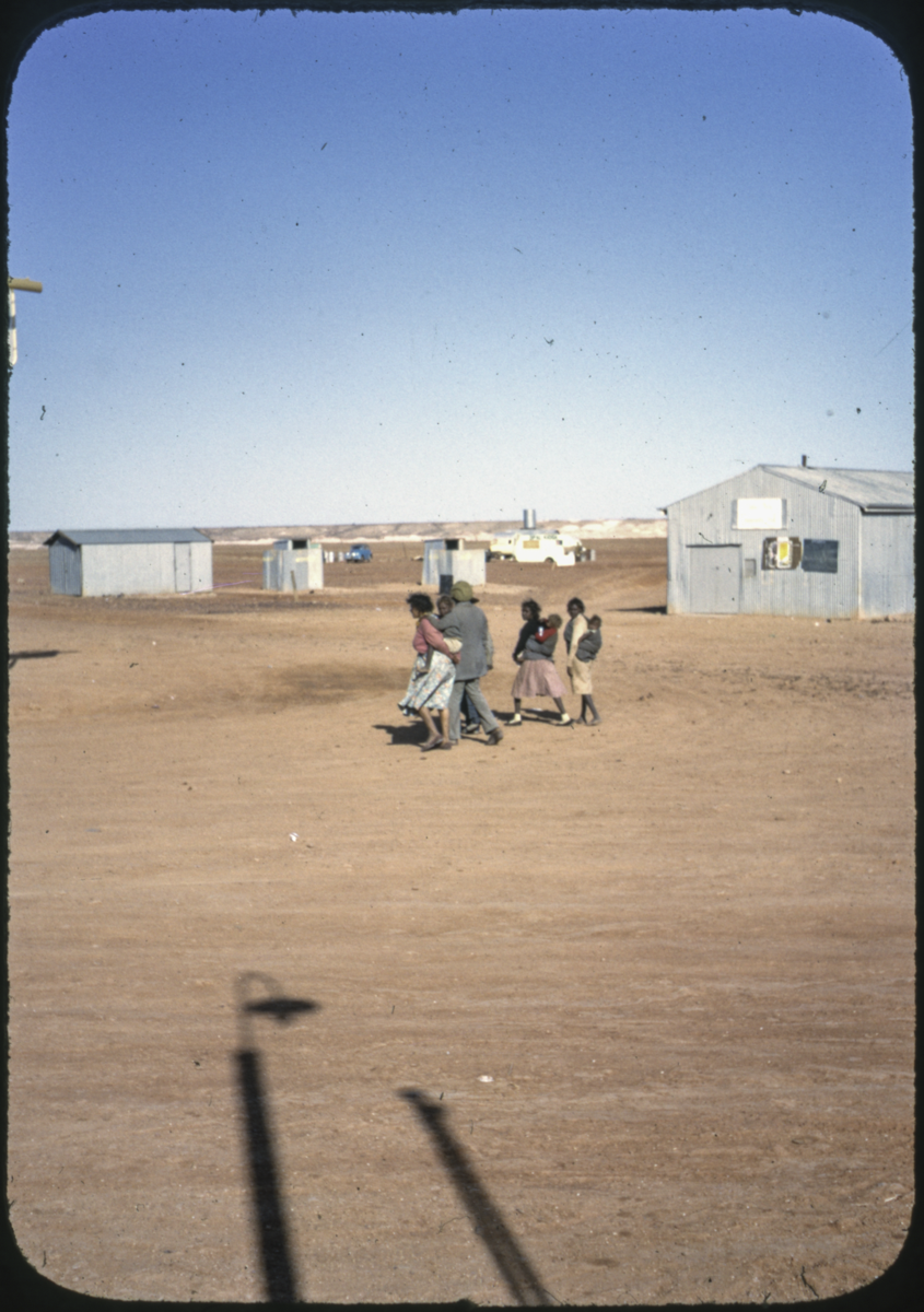 A group of Aboriginal women, carrying infants on their backs, and on man walking through the township of Coober Pedy. In the background are corrugated iron buildings. [JD 14/12/2021]