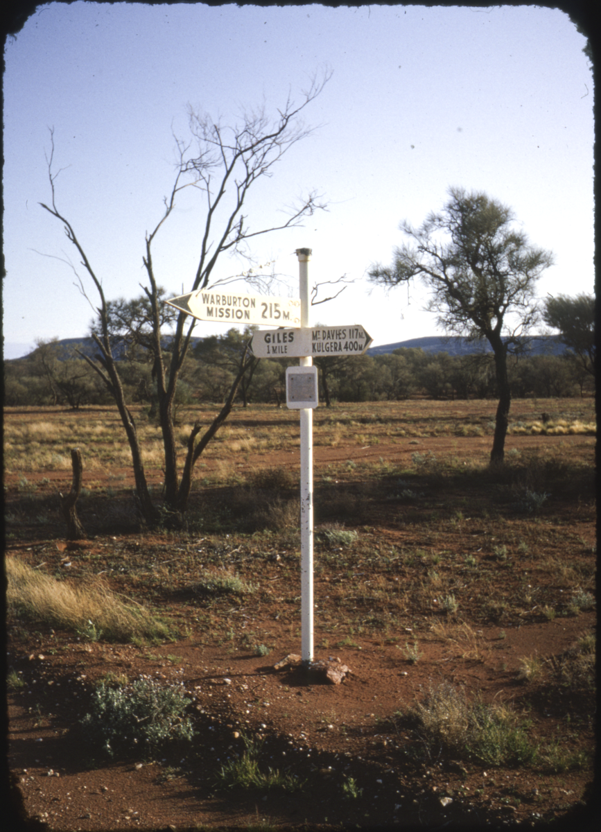 Signpost near Giles with three directions indicated, each reading 'Warburton Mission 215 m', 'Giles 1 mile', Mt Davies 117 m, Kulgera 400 m.'