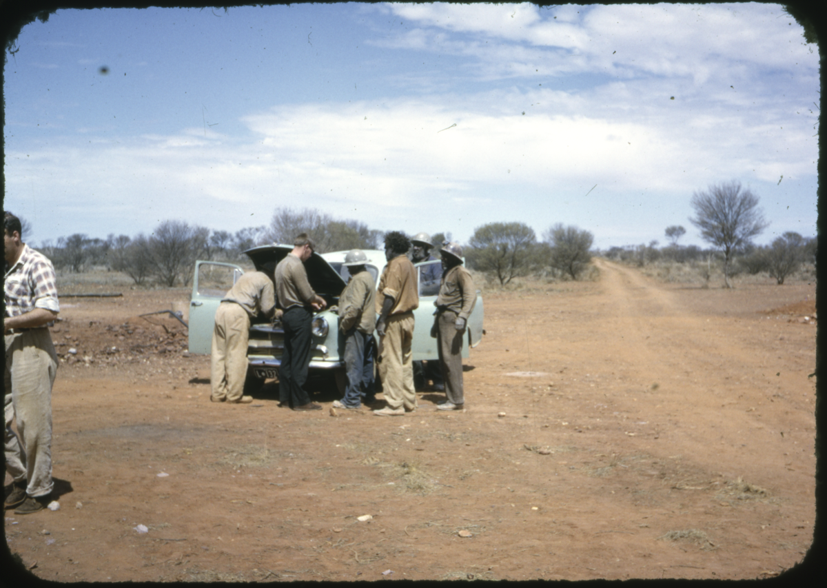 Four Aboriginal men, three of whom are wearing miners' hats, and two of who appear to be fixing a ute vehicle, standing with a fifth European man. In the background appears to be mining equipment.
