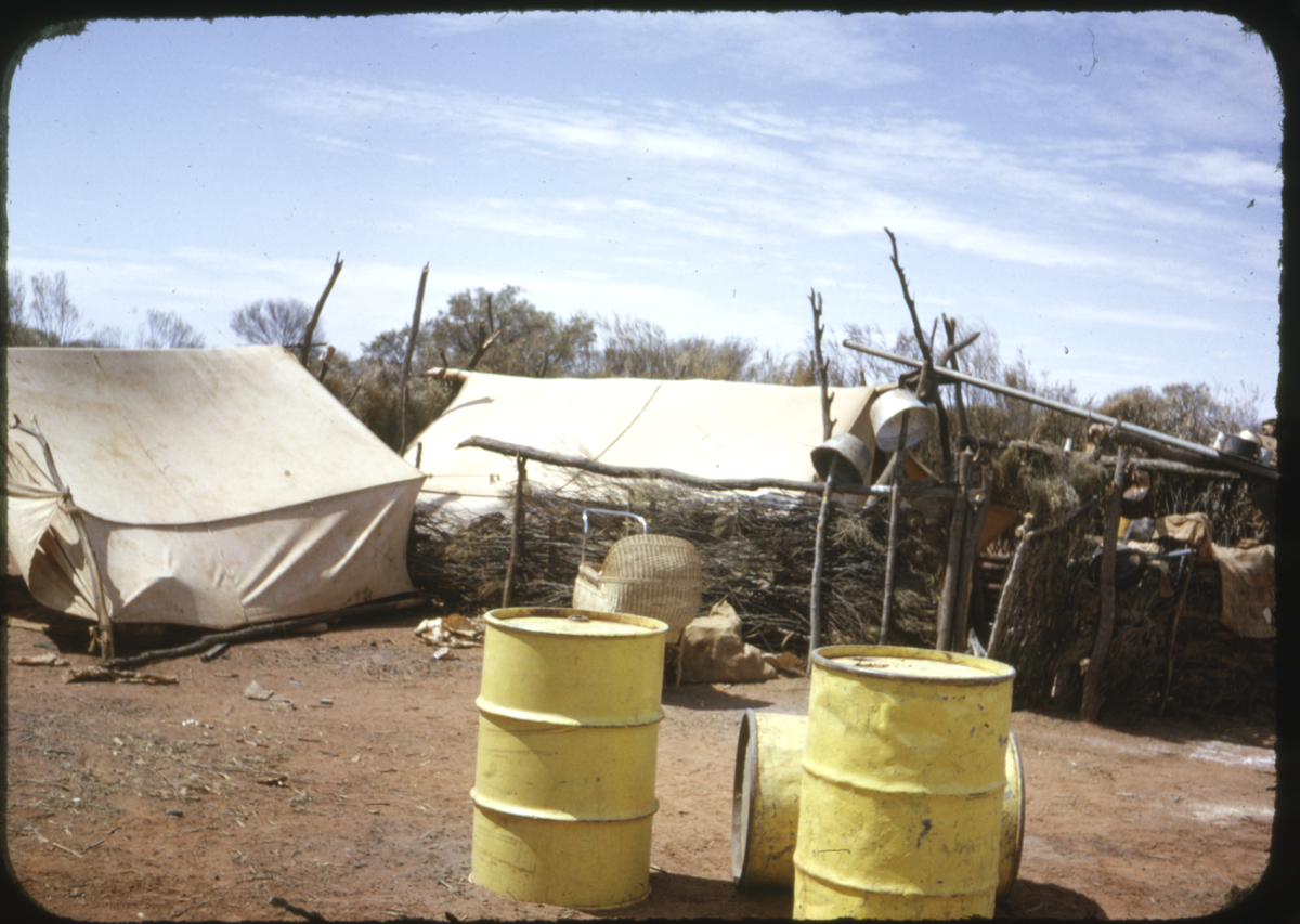 Camp site with two canvas tents and three oil drums at Goanna Patch.
