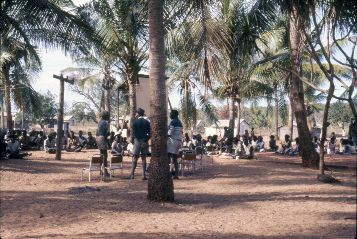 A village meeting at Galiwin’ku (also known as Elcho Island) is one of the Crocodile Islands located off the coast of north east Arnhem Land in the Northern Territory. Many of these photographs were taken around the site of the Methodist Church at Galiwin’ku. The former mission site is now Galiwin’ku town. At the time these photographs were taken the area around the church was used as meeting place and for activities such as dances and film screenings. David Burrumarra (author of The Whale and the Cross), was working with an anthropologist in the area at the time. The minister was Reverend Harold Shepperdson who appears in some of the photographs. [Knowledge shared by Joe Neparrnga Gumbula, Arnhem Land, with notes taken by Rachael Murphy and JD 10/7/2012]