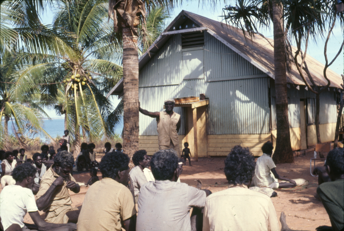A village meeting at Galiwin’ku (also known as Elcho Island) is one of the Crocodile Islands located off the coast of north east Arnhem Land in the Northern Territory. Many of these photographs were taken around the site of the Methodist Church at Galiwin’ku. The former mission site is now Galiwin’ku town. At the time these photographs were taken the area around the church was used as meeting place and for activities such as dances and film screenings. David Burrumarra (author of The Whale and the Cross), was working with an anthropologist in the area at the time. The minister was Reverend Harold Shepperdson who appears in some of the photographs. [Knowledge shared by Joe Neparrnga Gumbula, Arnhem Land, with notes taken by Rachael Murphy and JD 10/7/2012]