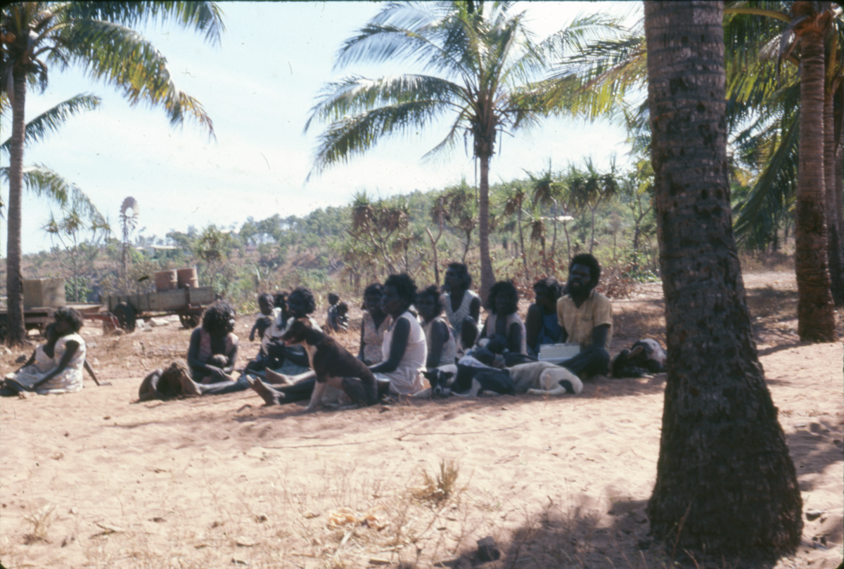 Place: Galiwin’ku (also known as Elcho Island) is one of the Crocodile Islands located off the coast of north east Arnhem Land in the Northern Territory. Many of these photographs were taken around the site of the Methodist Church at Galiwin'ku. The former mission site is now Galiwin'ku town. At the time these photographs were taken the area around the church was used as meeting place and for activities such as dances and film screenings. David Burrumarra (author of The Whale and the Cross), was working with an anthropologist in the area at the time. The minister was Reverend Harold Shepperdson who appears in some of the photographs. [Knowledge shared by Joe Neparrnga Gumbula, Arnhem Land, with notes taken by Rachael Murphy and JD 10/7/2012]