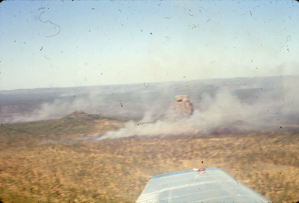 Aerial view from a plane of the Rock near Oenpelli, possibly with bush fires? around the surrounding landscape. [JD 29/8/2012]