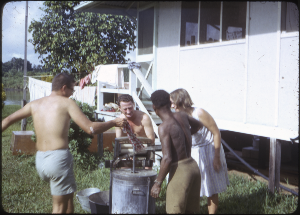 Patricia Townsend, Bill Townsend, Mervyn Meggitt, and the man depicted in T.68700, washing their clothes in the washing machine outside the Summer Institute of Linguistics house, Ambunti. [Mark Elliott 05/03/04]