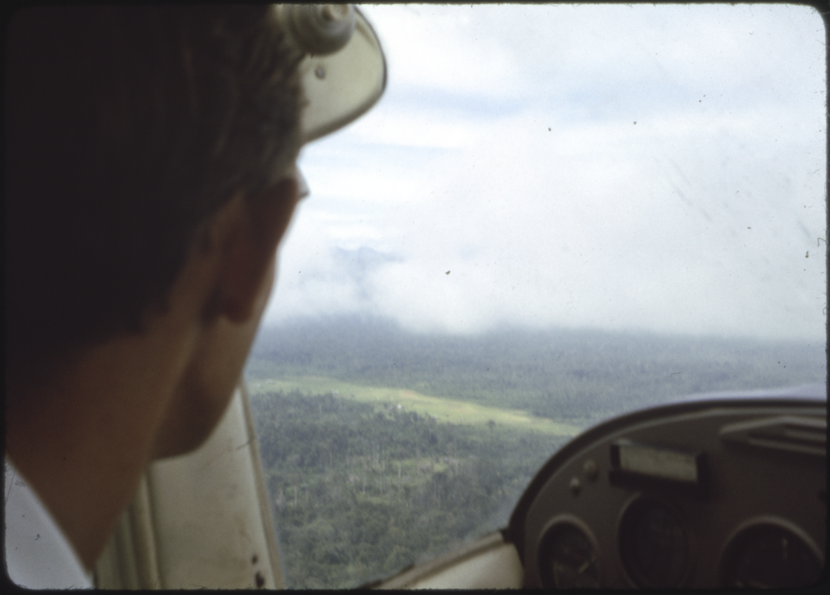 Bill Townsend sitting in the cockpit of a light aircraft, looking out at the Sepik landscape below [Andrew Moutu 20/02/04].