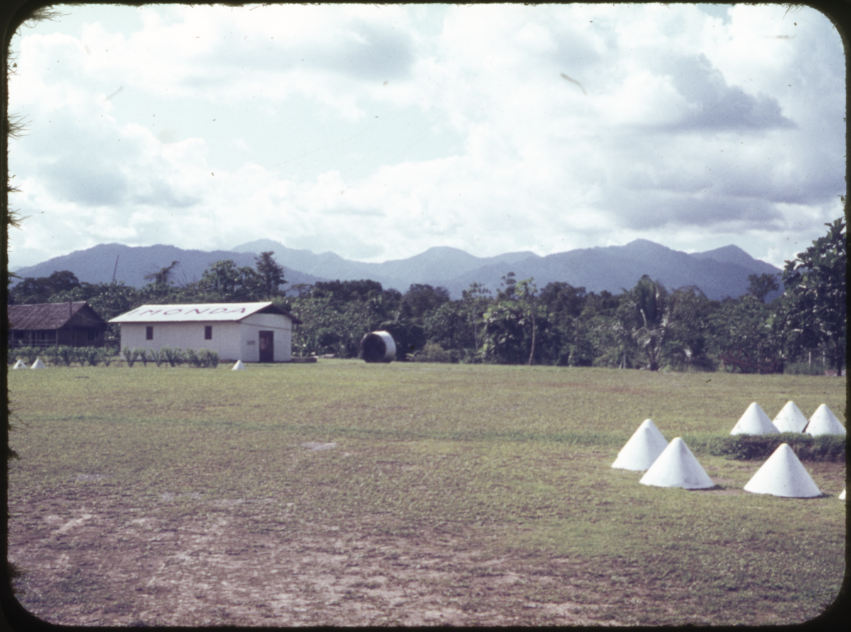 Imonda airstrip. Large building of modern materials and construction to the left, painted white with "Imonda" written on the roof in large capital letters. Behind it is a similar house, constructed from ?traditional materials. White conical objects [?signals or ?markers] are dotted around the open ground on either side of the scene [Andrew Moutu 24/02/04].