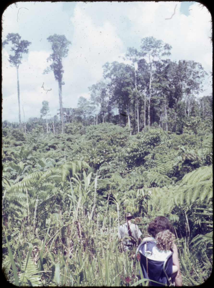 ?Clark and Dorothy Graham walking through tall foliage, away from the camera. Dorothy Graham is carrying her daughter in a strap on her back. ?Clark Graham has a ?rifle over his shoulder (Sandaun) Province. [Andrew Moutu 24/02/04].