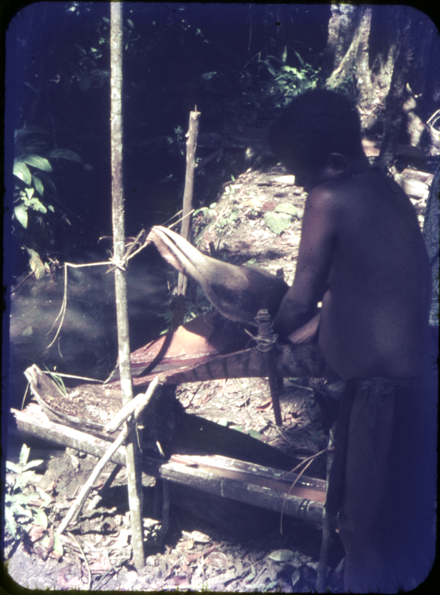A woman from Naineri village washing sago pulp at the trough. The starch gathers in the container below the trough after the sago pulp has been washed and squeezed thoroughly with water [Andrew Moutu 24/02/04].